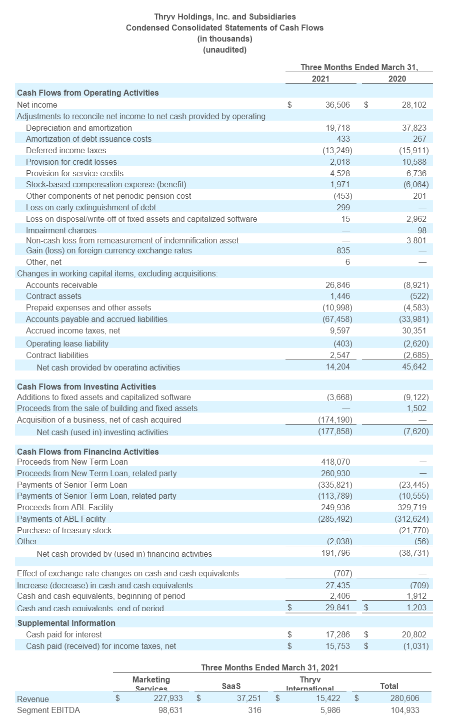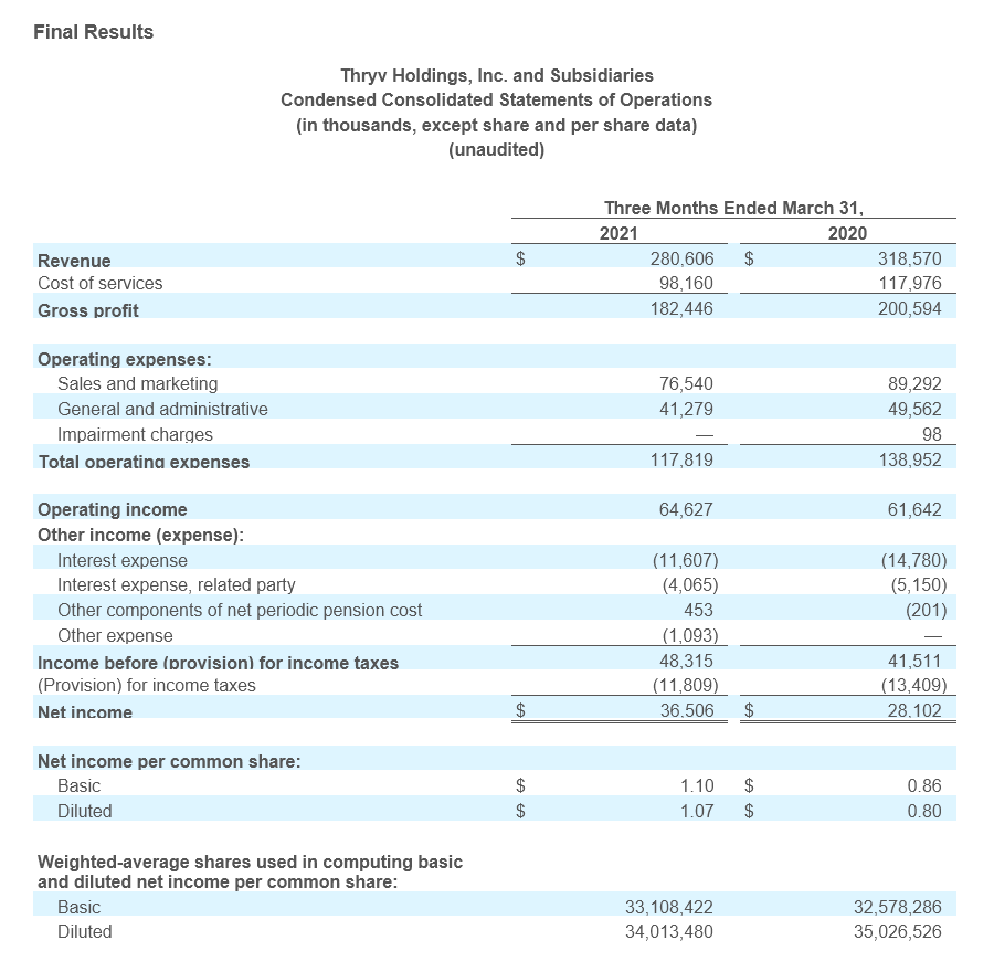 DALLAS, May 13, 2021 – Thryv Holdings, Inc. (NASDAQ:THRY) (“Thryv” or the “Company”), the provider of Thryv® software, the end-to-end client experience platform for growing small businesses, announced financial results for the first quarter 2021. The Company has also raised its 2021 outlook for its SaaS segment.